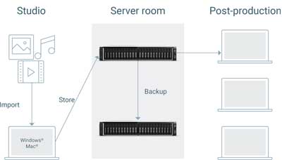 Armazene projetos no TS-h3077AFU. As pastas NAS podem ser montadas no Windows ou Mac via 25/10 GbE, permitindo uma economia de tempo e esforço.