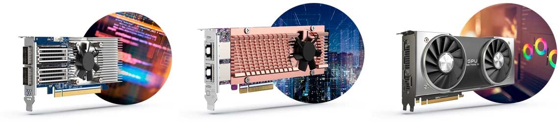 Placas QM2: Adicionam SSD M.2 ou conectividade extra de 10/2,5 GbE ao NAS para otimizar o desempenho e a largura de banda.
