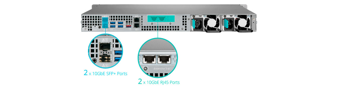 O TS-h977XU-RP integra 2x entradas Gigabit RJ45 e 2x portas 10GbE SFP+, incluindo uma placa de expansão de 2x conexões 10GbE pré-instalada em um slot PCIe.