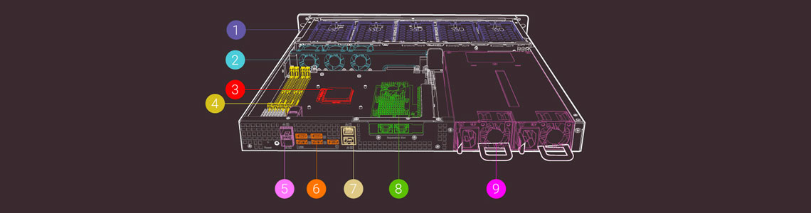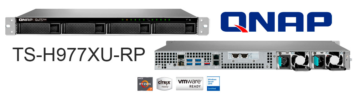 O TS-h977XU-RP Qnap possui 4 baias para discos SATA e 5 slots para memórias SSD, hot-swappable, fontes redundantes, processador AMD Ryzen 7 8-core, 32GB de memória RAM, 4x slots PCIe, 2x portas LAN e 2x portas 10GbE SFP+.