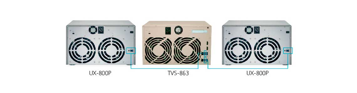 O storage Qnap suporta expansão de capacidade online através da conexão de um gabinete de expansão. Como a solução é escalável, a capacidade do NAS pode ser gradualmente expandida sob demanda.