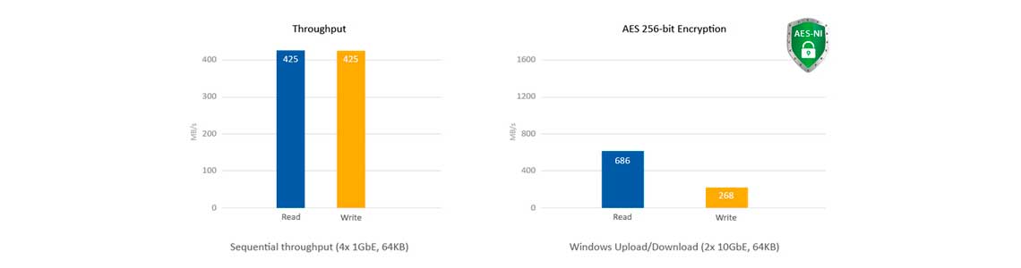 O TVS-463 possui mecanismo de encriptação acelerada por hardware com AES-NI e proporciona desempenho até 686MB/s com criptografia AES-256 bits, aumentando significamente a segurança do sistema.