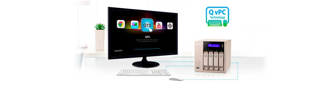 A tecnologia exclusiva QNAP QvPC consolida tecnologias como integração VM, transcodificação de multimídia, saída HDMI, integração de nuvem e tecnologias de conexão, permitindo assim utilizar o storage 8 HDs Qnap como um PC quando conectado a um teclado, monitor e mouse.