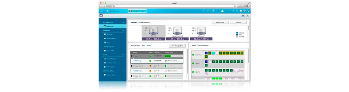 O QTS Storage Manager apresenta organizadamente ferramentas e opções para o gerenciamento do sistema que simplifica o processo de expansão do Storage NAS e do gerenciamento dos gabinetes de expansão.