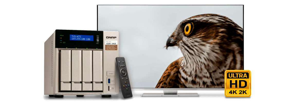 Oferecendo 22 saídas HDMI, o TVS-473 suporta configurações de área de trabalho “duplicada” ou “estendida” em até duas telas. Ao usar os recursos de media player através do HybridDesk Station (HD Station), é possível acessar o conteúdo pelo controle remoto, que está incluso no pacote.
