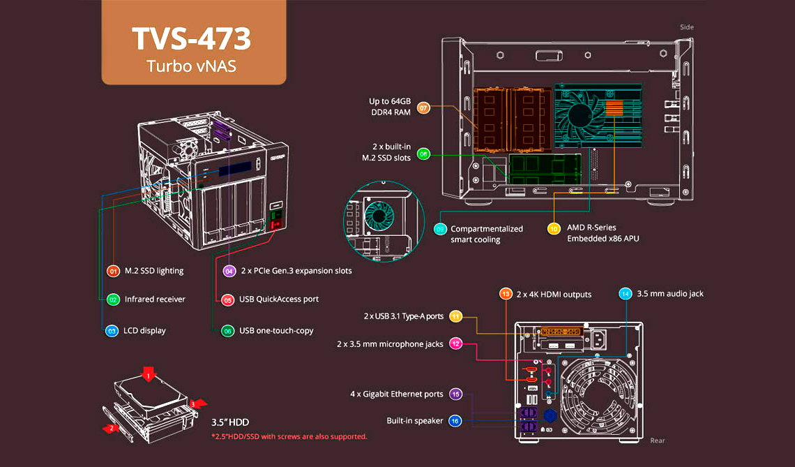 Equipado com processador Quad Core 2.1GHz AMD RX-421BD, 8GB RAM (sendo expansível 64GB) e 4 portas LAN gigabit, o TVS-473 permite processamento multitarefa e permite até 1.035MB/s com expansão opcional 10GbE.
