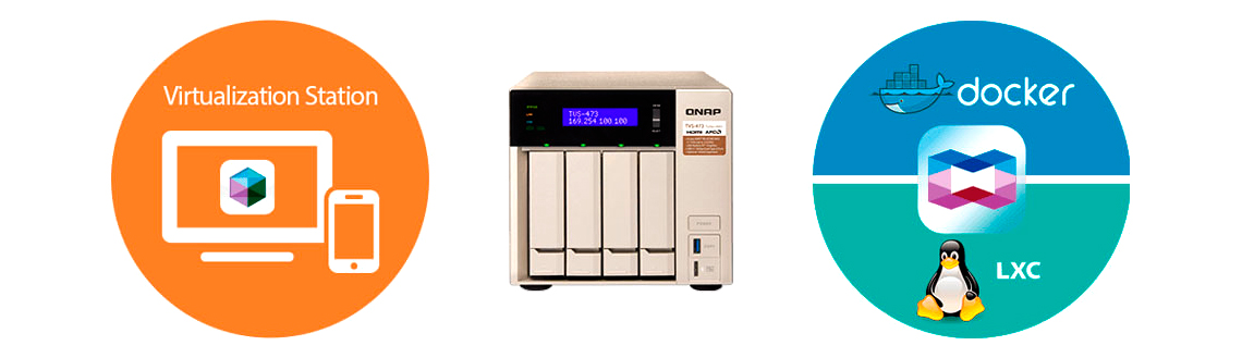 O TVS-473 oferece Container Station que integra tecnologias de virtualização LXC e Docker, permite operar múltiplos sistemas Linux, assim como baixar aplicativos a partir do Docker Hub Registry. Além de suportar plataforma QIoT Containers para estruturar rapidamente um ambiente IoT e implantar na nuvem IoT privativa do usuário.