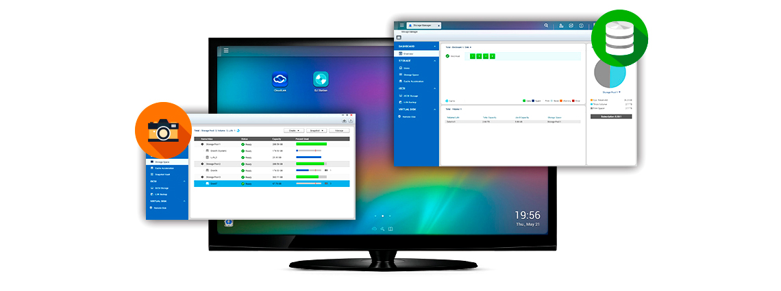 Possibilita snapshots de volumes e LUN (até 256 snapshots por volume ou LUN e 1.024 snapshots por NAS), replicação de snapshots de volume/LUN via Snapshot Replicator para servidores remotos, o TVS-473 protege informações copiando apenas as alterações realizadas, clonando rapidamente um volume/LUN snapshot com volume local sem interromper a operação do sistema.