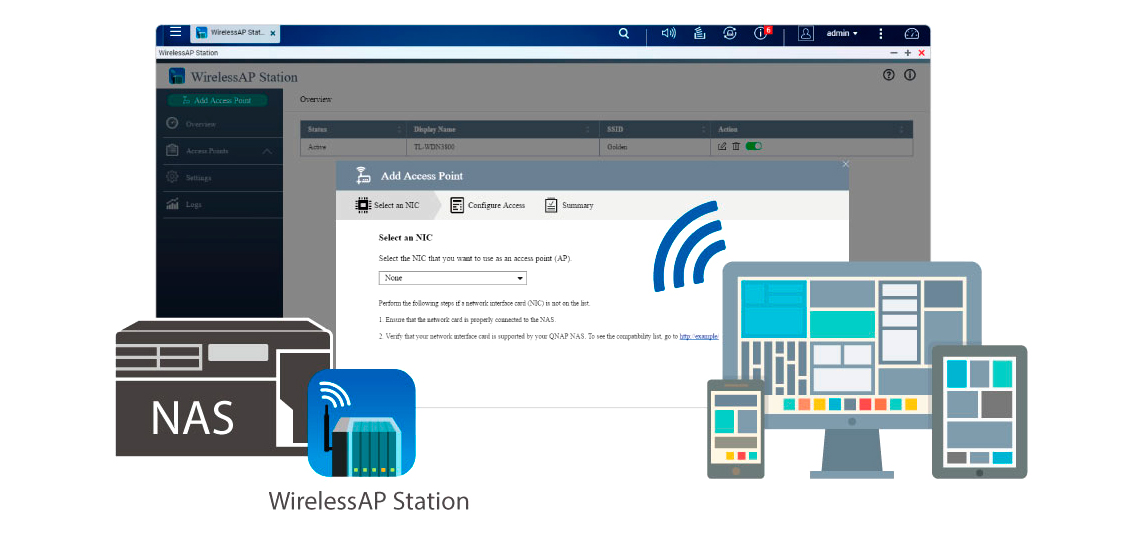 Por meio do aplicativo WirelessAP Station e um adaptador sem fio PCIe compatível, todos dispositivos WiFi comunicam-se com o TVS-473 de forma direta, evitando um possíveis reduções de performance que ocorrem quando o roteador de banda larga estiver ocupado.