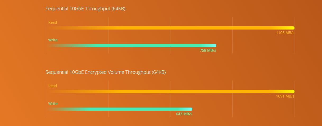O Qnap NAS também oferece um desempenho de criptografia com um mecanismo de criptografia de aceleração por hardware com o AES-NI (até 1091 MB/s com criptografia de volume NAS completa AES 256-bit) aumentando o desempenho do sistema e garantindo a segurança de dados corporativos armazenados no NAS.