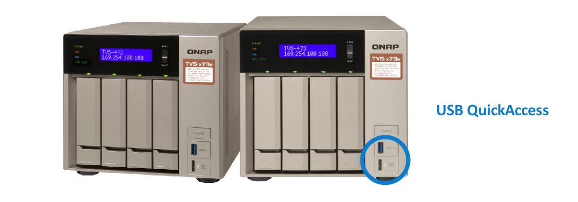 A inovadora porta USB QuickAccess do TVS-473e facilita a primeira instalação do NAS e fornece acesso direto aos arquivos armazenados sem a necessidade de conexão com a rede.