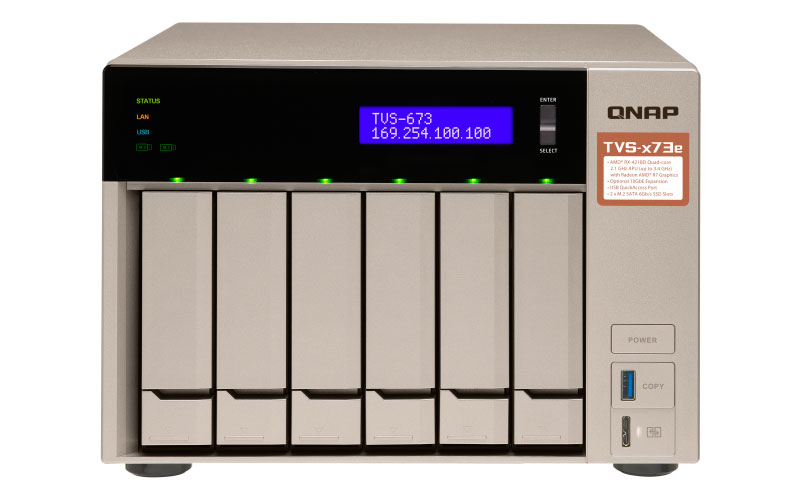 O TVS-673e é equipado com uma APU AMD R-Series incorporado a CPU com desempenho gráfico AMD Radeon R7, oferecendo uma solução NAS de alto desempenho e eficiência no consumo de energia.