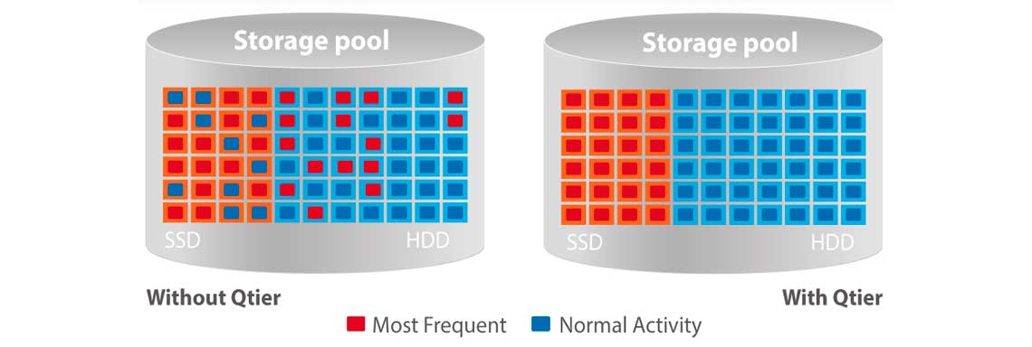 Qtier: A tecnologia Qtier impulsiona o armazenamento em camadas automáticas com otimização contínua de dados em SSDs de alto desempenho e HDDs de alta capacidade com base na frequência de acesso. O I / O-Aware Qtier pode reservar um espaço semelhante a um cache no SSD em camadas para lidar com o burst I / O em tempo real.