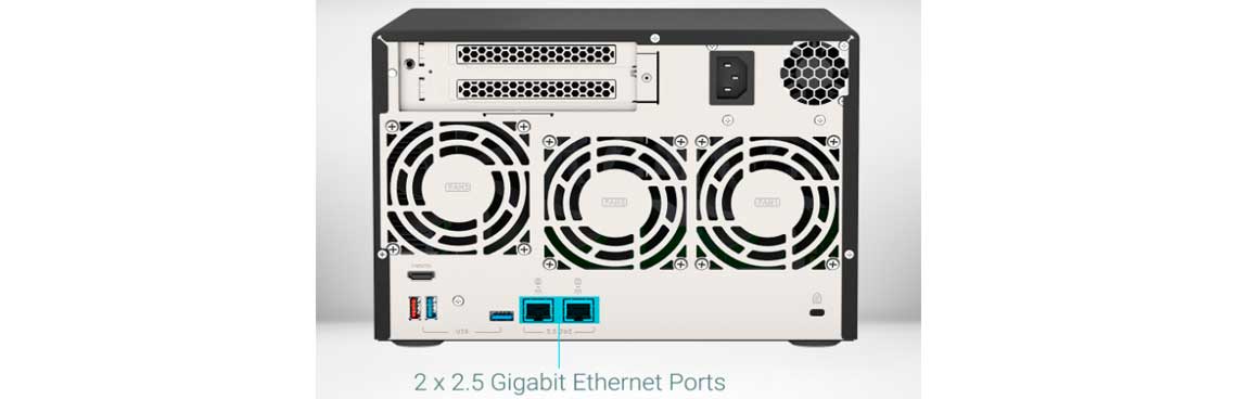 O TVS-675 possui duas portas LAN que permitem que o usuário use cabos CAT5e existentes para atualizar as velocidades de rede de 1 Gigabit para 2,5 Gigabit.