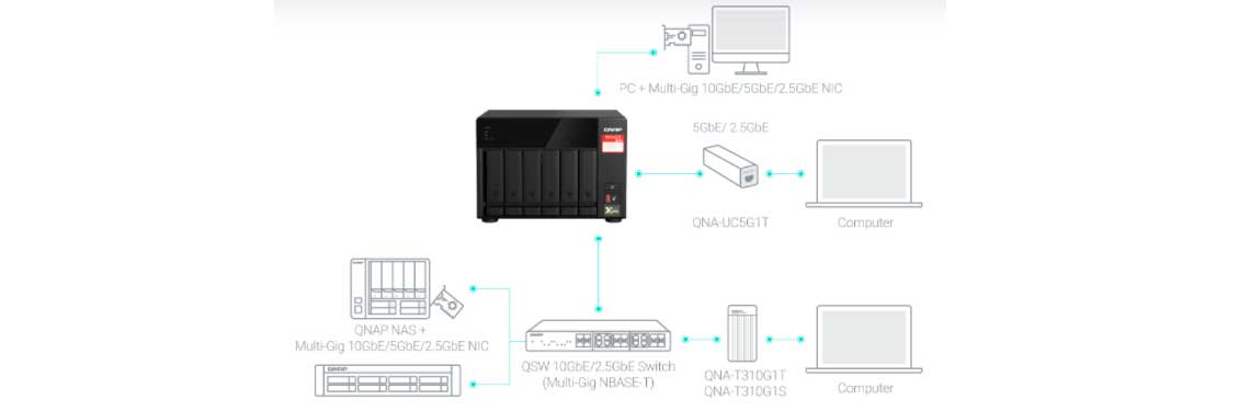 A Qnap também fornece placas PCIe de 2,5GbE / 5GbE / 10GbE e adaptadores USB 5GbE para estações de trabalho Windows / Linux, permitindo que o usuário crie facilmente um ambiente de rede de alta velocidade para colaboração produtiva em equipe.