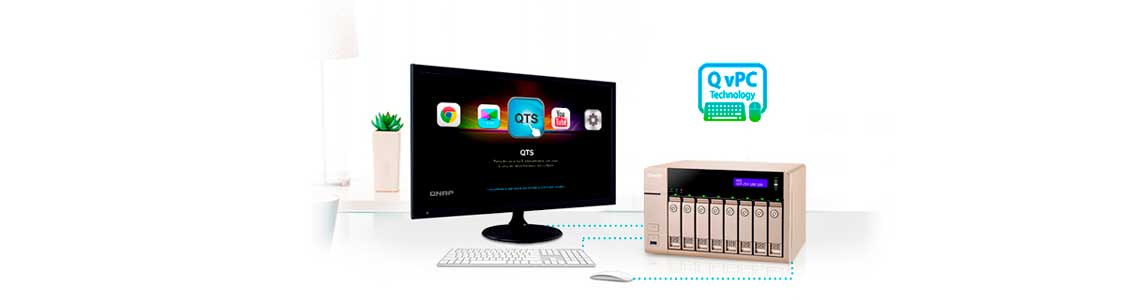 A tecnologia exclusiva QNAP QvPC consolida tecnologias como integração VM, transcodificação de multimídia, saída HDMI, integração de nuvem e tecnologias de conexão, permitindo assim utilizar o storage 8 HDs Qnap como um PC quando conectado a um teclado, monitor e mouse.