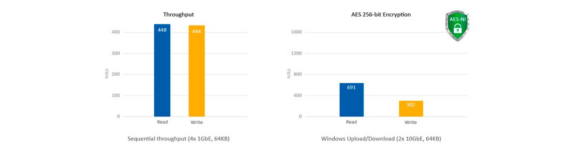 O TVS-863 possui mecanismo de encriptação acelerada por hardware com AES-NI e proporciona desempenho até 691MB/s com criptografia AES-256 bits, aumentando significamente a segurança do sistema.