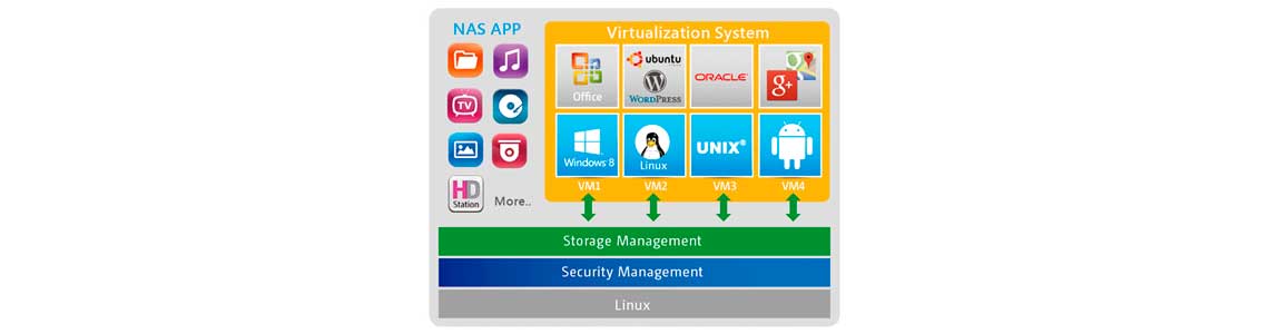 O NAS Qnap suporta VMware e VAAI Microsoft ODX e disponibiliza os plug-ins vSphere Client e SMI-S Provider Qnap, melhorarando a eficiência na gestão de aplicações de virtualização.