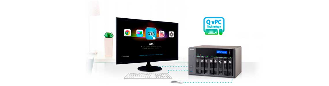A tecnologia exclusiva Qnap QvPC consolida tecnologias como integração VM, transcodificação de multimídia, saída HDMI, integração de nuvem e tecnologias de conexão, permitindo assim utilizar o storage Qnap como um PC quando conectado a um teclado, monitor e mouse.