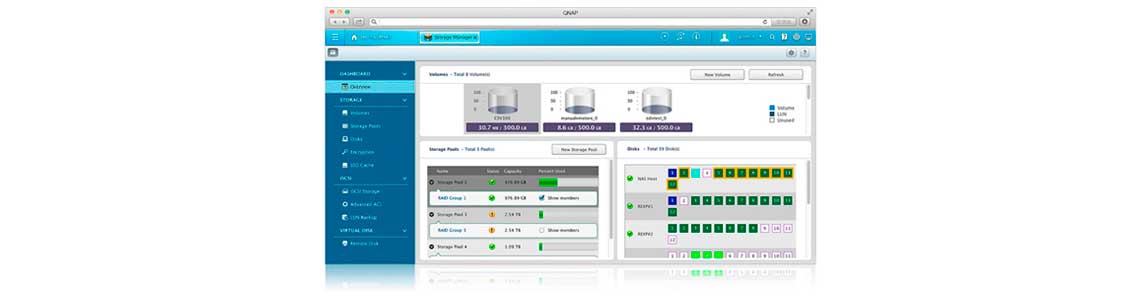 O QTS Storage Manager apresenta ferramentas para o gerenciamento do sistema que simplifica muito o processo de expansão da capacidade e gerenciamento das expansões RAID.