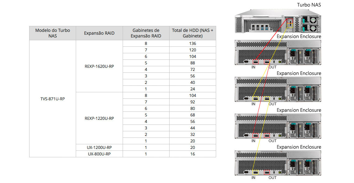 O TVS-871U-RP suporta expansão de capacidade on-line conectando múltiplos de gabinetes de expansão RAID QNAP. Com o aumento de capacidade QNAP, a capacidade de armazenamento bruto pode ser expandida gradualmente para atender às necessidades de crescimento de dados de negócios.