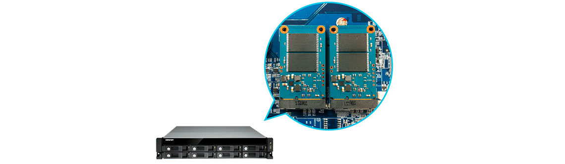O TVS-871U-RP possui duas portas mSATA integradas para instalação de módulos de memórias (compra opcional) e aumento do desempenho de IOPS. Com isso o fluxo de trabalho em aplicações de IOPS melhora.