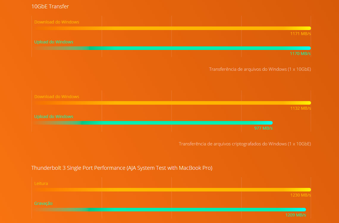 O iMac Pro apresenta uma porta ethernet de 10Gb, assim o TVS-872XT fornece uma base de armazenamento com alta performance para que os usuários possam escolher entre as conexões Thunderbolt 3 e 10GbE para atender as necessidades de aplicativos e dispositivos, pois o storage possui portas 10GbE e Thunderbolt 3
