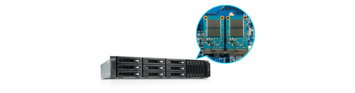 Com dois módulos 128GB mSATA instalados e suportando discos SSDs para cache em todas as baias de discos, o usuario pode instalar discos SSDs de alto desempenho no TVS-EC1280MU-SAS-RP, aumentando consideravelmente o IOPS do storage.
